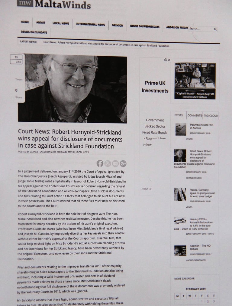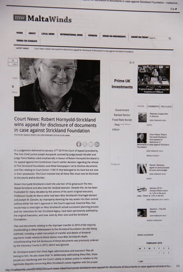 Malta Winds - Court New: Robert Hornyold-Strickland wins appeal for disclosure of documents in case against Strickland Foundation