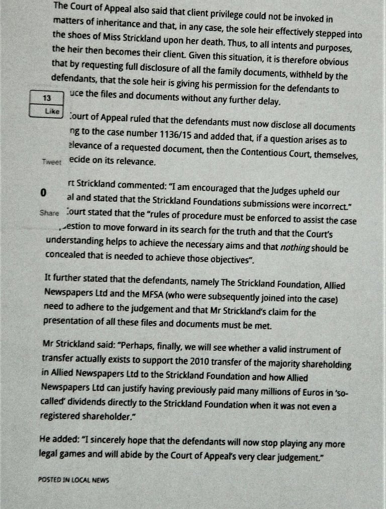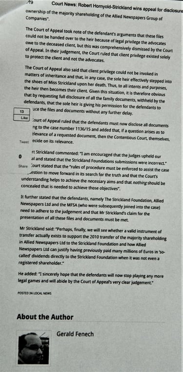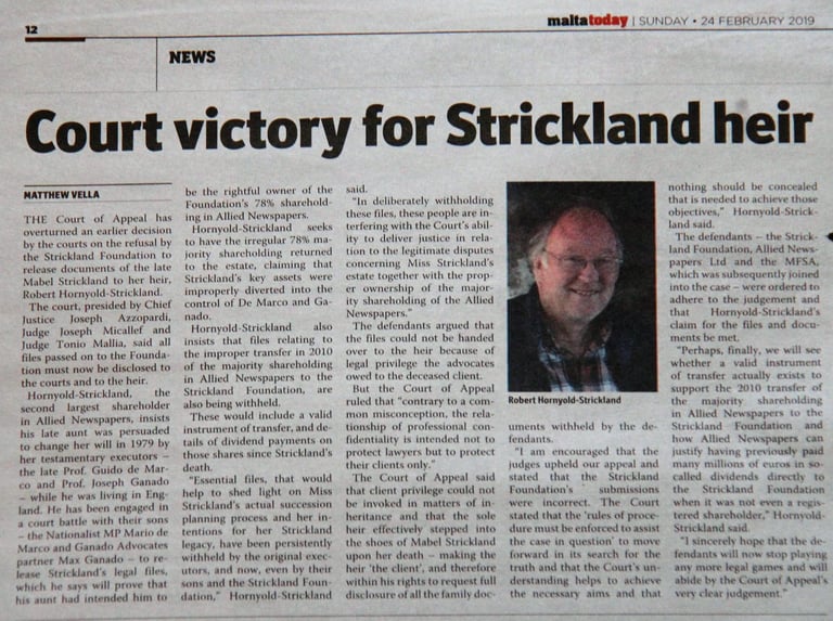 Malta Today - Strickland heir’s right to secret files confirmed by Appeals Court